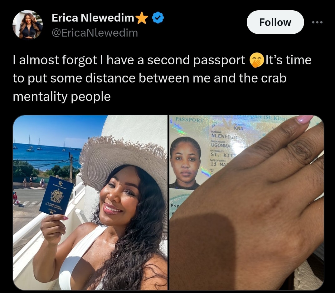 Nigerian actress, model, and entrepreneur Erica Nlewedim recently announced to her followers her acquisition of a Caribbean passport.