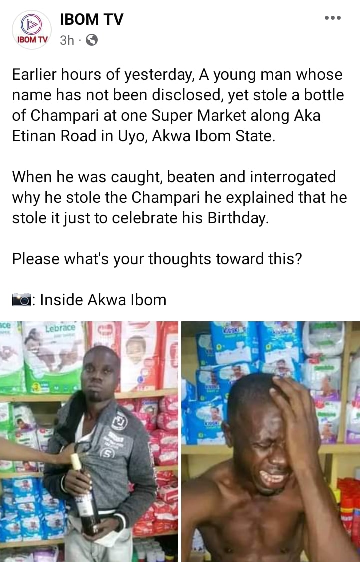 “Earlier hours of yesterday, A young man whose name has not been disclosed, yet stole a bottle of Champari at one Super Market along Aka Etinan Road in Uyo, Akwa Ibom State.