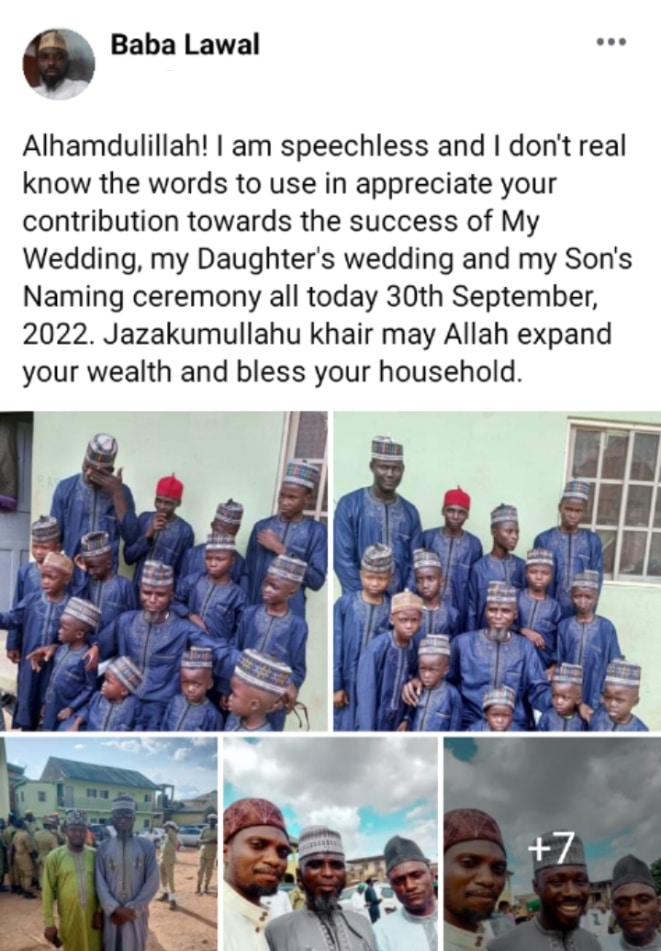 “Alhamdulillah! I am speechless and I don’t really know the words to use to appreciate your contribution towards the success of My Wedding, my Daughter’s wedding and my Son’s Naming ceremony all today 30th September 2022. Jazakumullahu Khair may Allah expand your wealth and bless your household.”