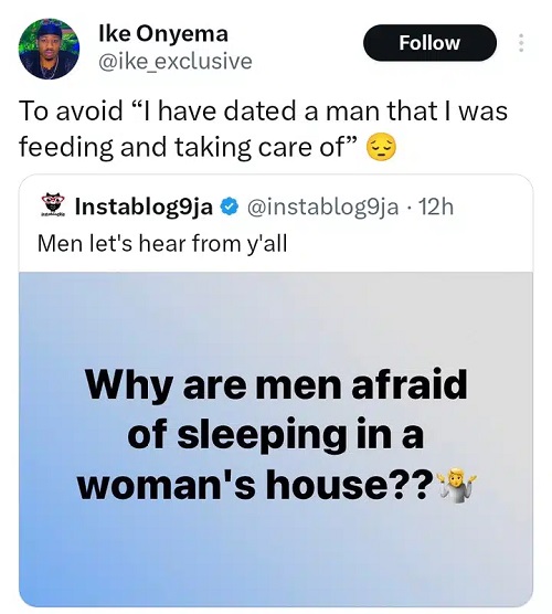 He was reacting to a question which asked men why they are afraid of sleeping in a woman’s home.